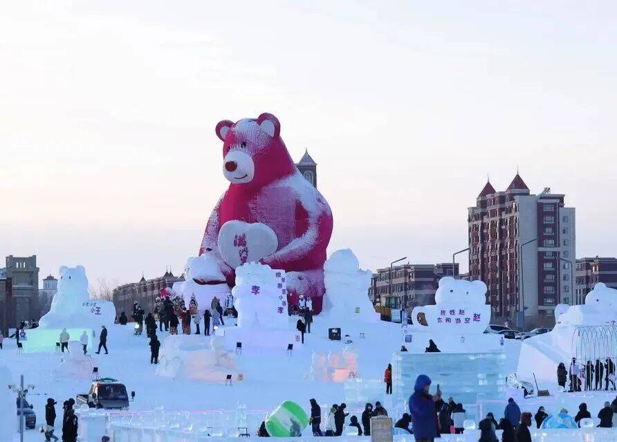 “绒绒雪世界”内有全国唯一可居住冰雪酒店,主题冰雕、非遗集市与全龄娱乐设施,共同构筑出“暖暖呼伦贝尔,绒绒雪世界”的温情童话。